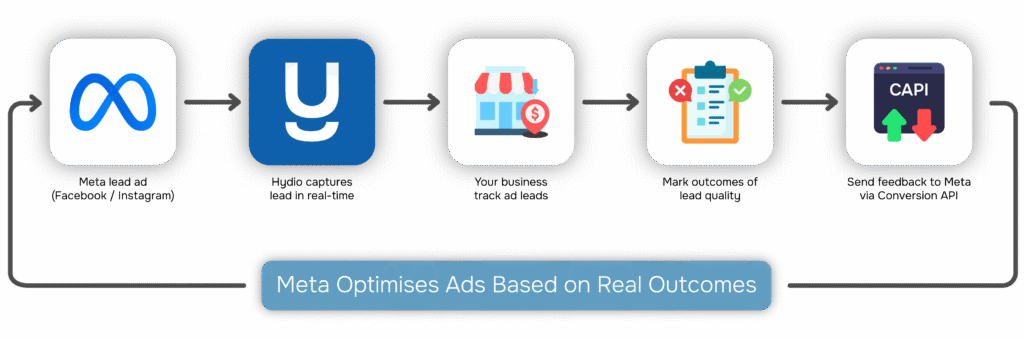 Hydio connects to your Meta ad account in just two clicks and captures every lead in a built-in CRM — no manual work needed. You mark what happened (sale, demo, no show), and Hydio sends that insight back to Meta. The result? Smarter ads, better leads, and higher ROI.